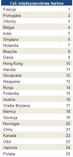 Natomiast w 7 z 25 krajów kariera międzynarodowa znalazła się wśród trzech priorytetów. W czołówce aspirujących do sukcesów na skalę globalną znaleźli się Francuzi (miejsce 1.), zaraz za nimi uplasowali się Portugalczycy (miejsce 2.), Włosi (miejsce 3.), Belgowie (miejsce 4.) oraz mieszkańcy Indii (miejsce 5.). Najmniejsze zainteresowanie międzynarodową karierą przejawiają Chińczycy (miejsce 21.), Kanadyjczycy (miejsce 22.), Amerykanie (miejsce 23.), Japończycy (miejsce 24.) i właśnie Polacy (miejsce 25.).