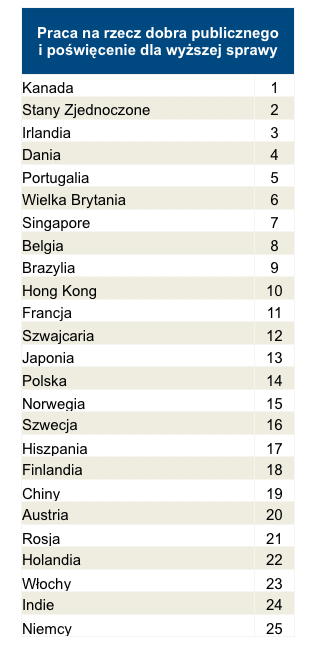 Tuż za podium plasują się Duńczycy i Portugalczycy. Na drugim biegunie są Rosjanie, Holendrzy, Włosi, mieszkańcy Indii oraz Niemcy – są dość obojętni wobec wyższych celów.